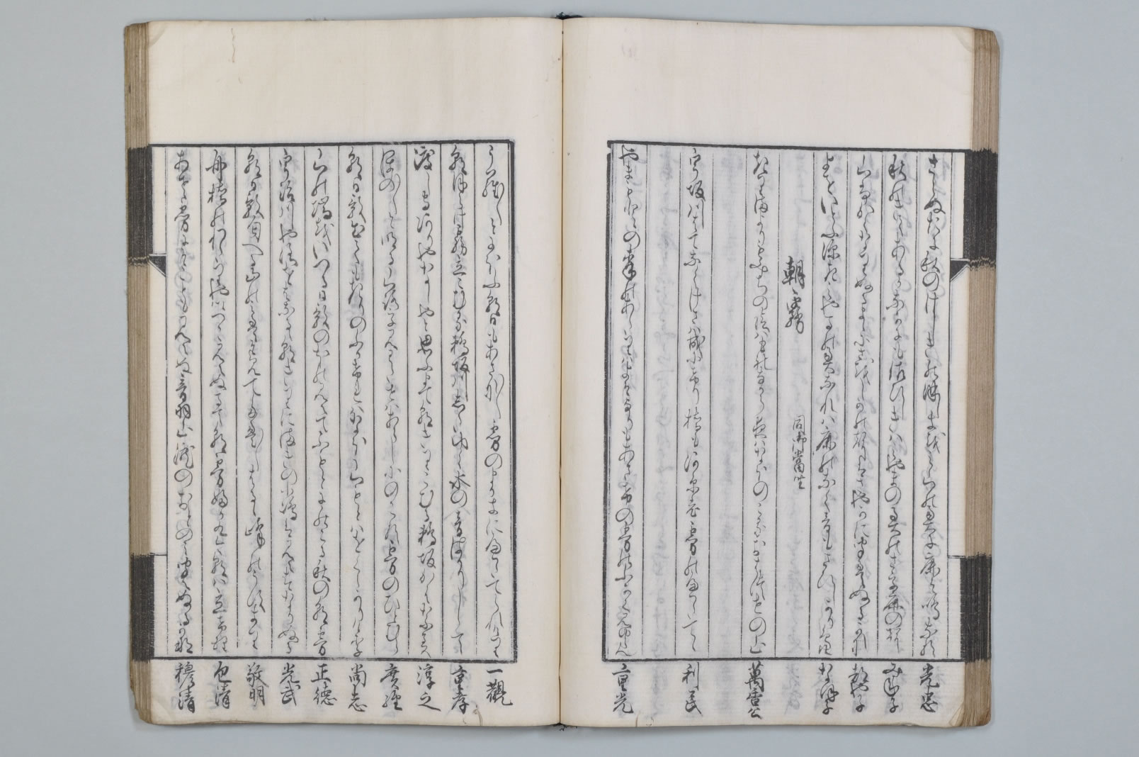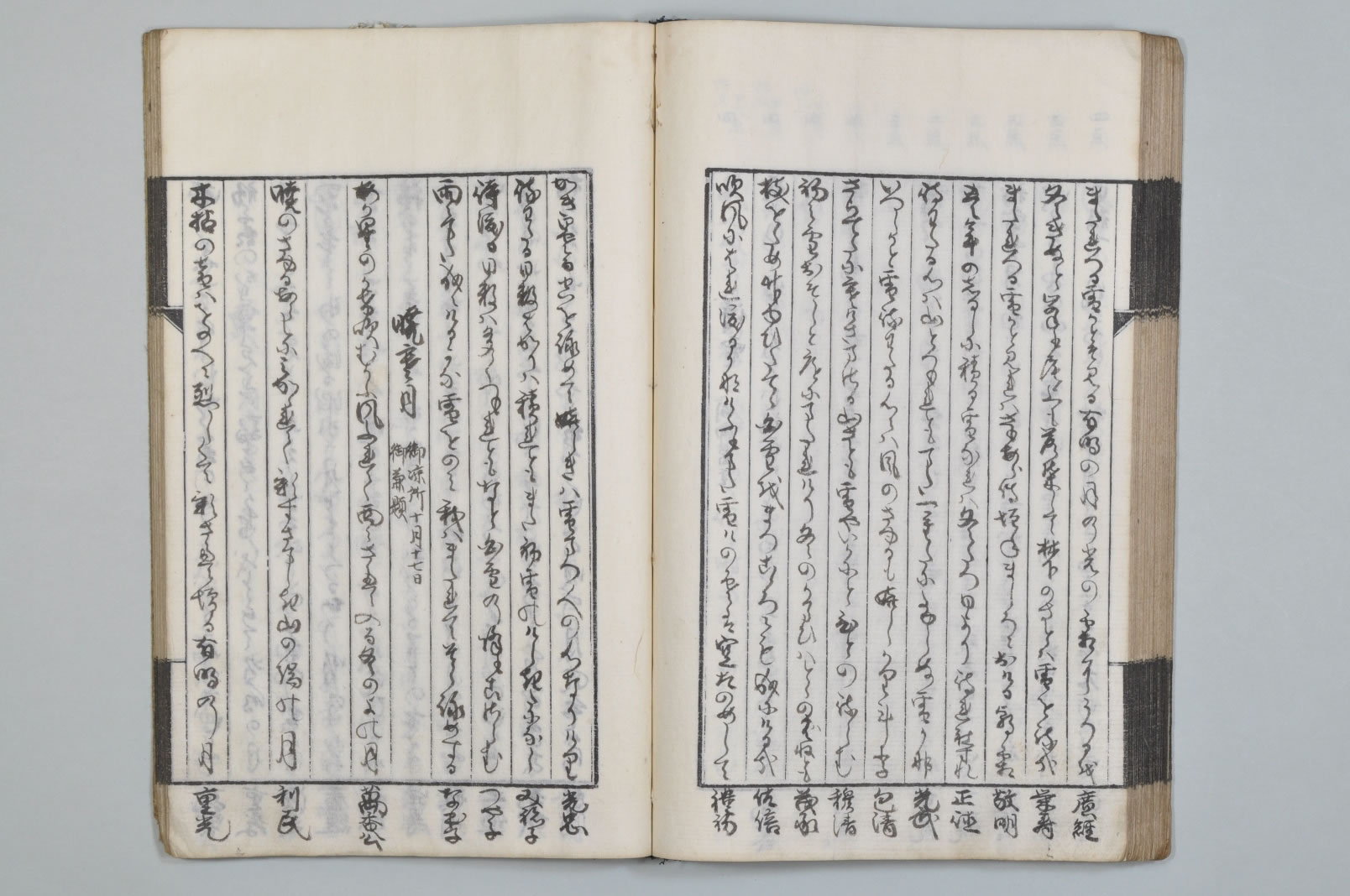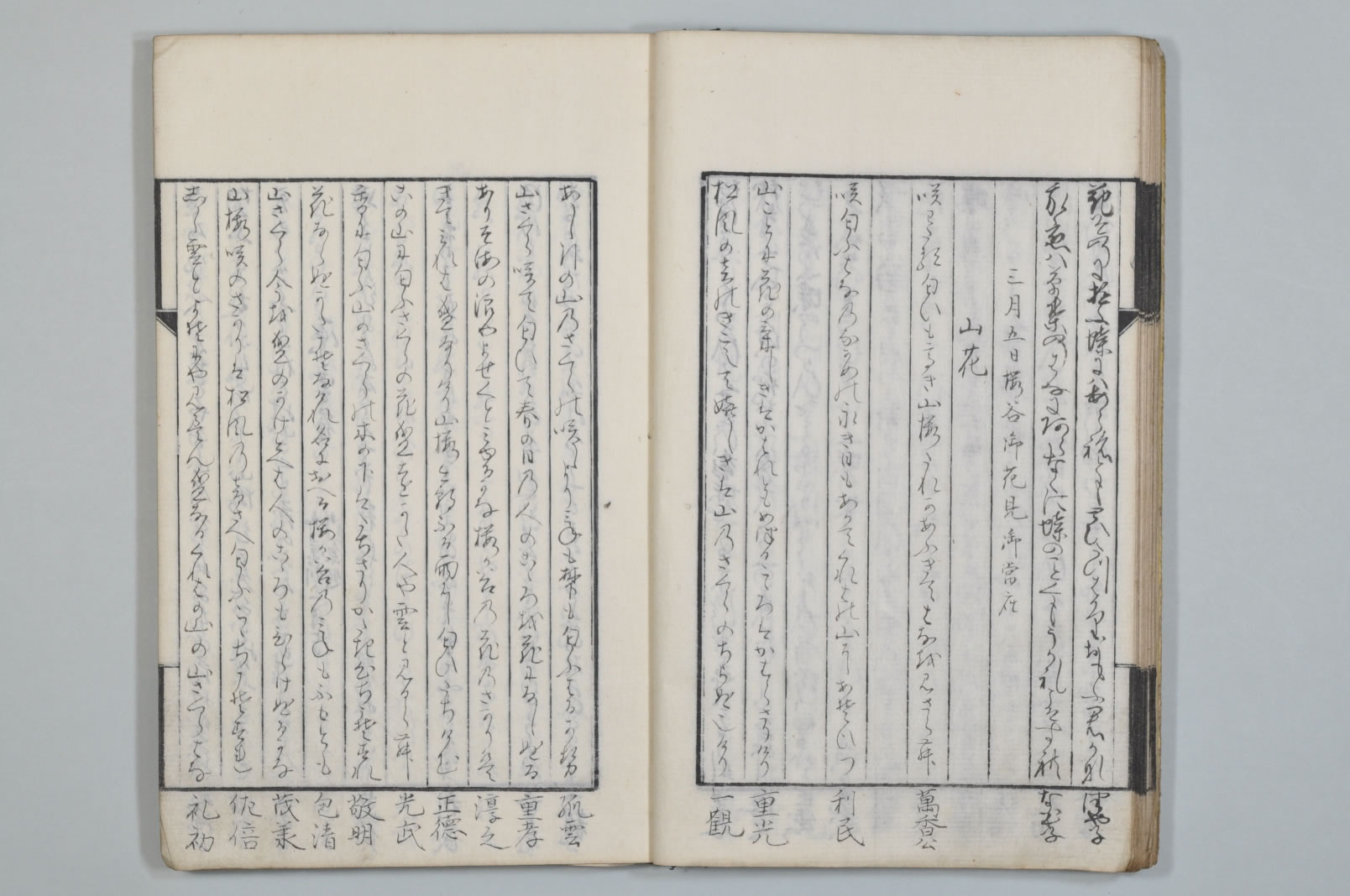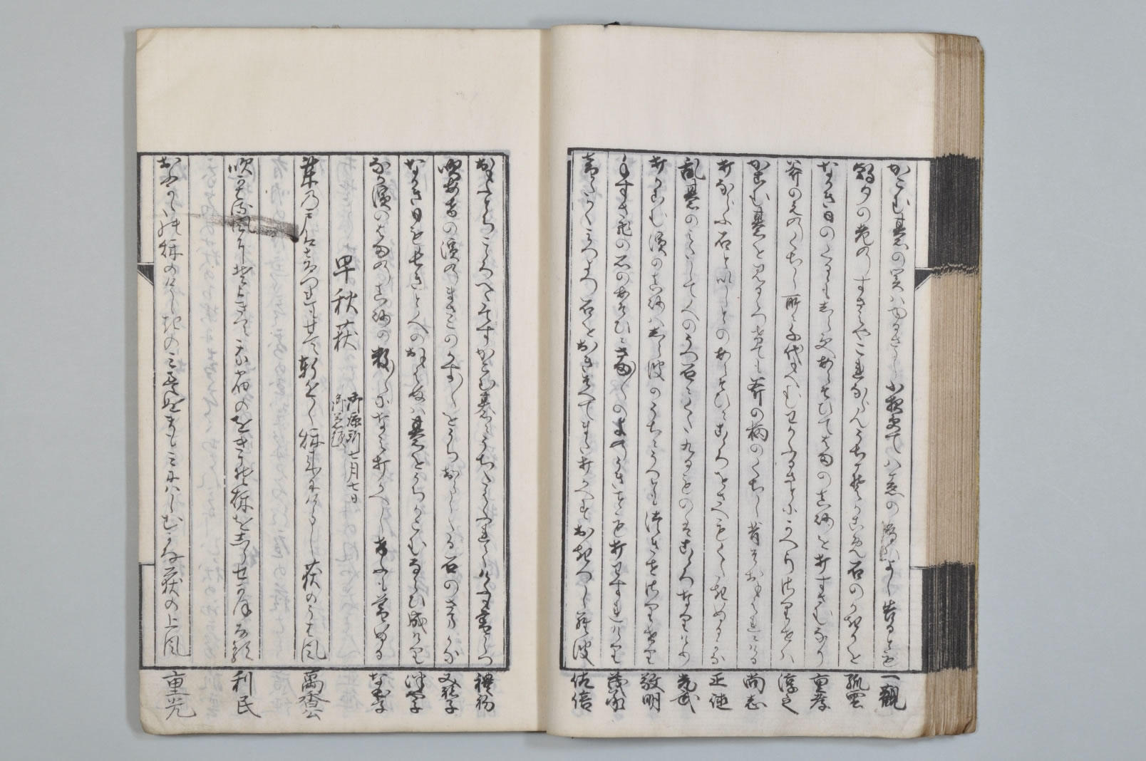 - 巻頭:「梅花薫風(嘉永三年正月五日御正式御発會/御兼題但シ御懐紙)最終丁版心:「御歌留中ノ紙百貳拾七枚也」印記:「若鳥」他印文未詳印2〔うち1つは「萬香文庫」か〕顆