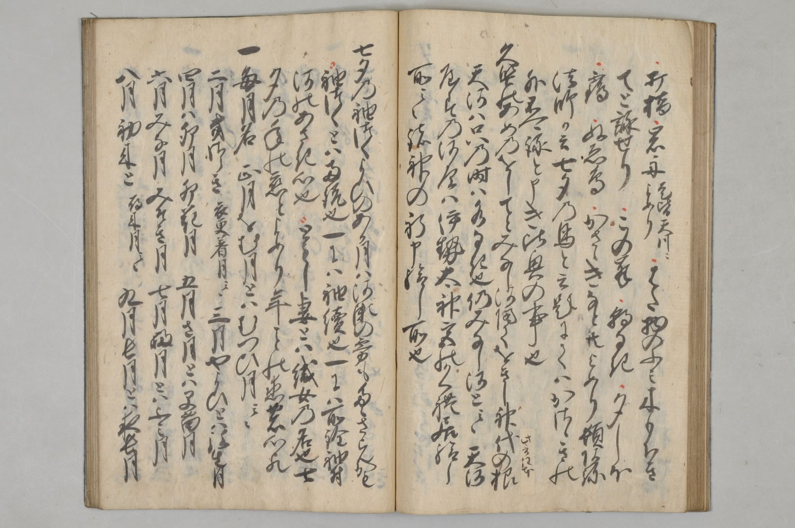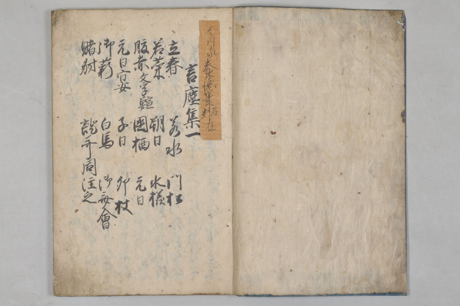 - 藍色地雷文崩し押型表紙表紙:「言塵集上/養徳筆」「言塵集下/養徳筆」奥書:「全部養徳(花押)」第1冊目録に「今川家養徳筆(名/判)在」と記したる附箋貼附けあり印記:「月明莊文庫〔複廓朱長方印〕」第1冊:63丁、第2冊:69丁