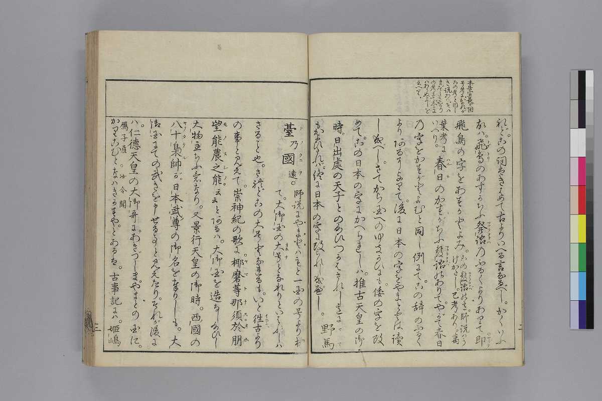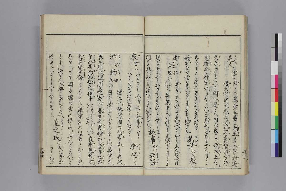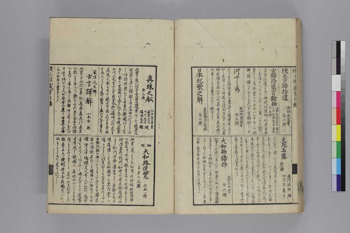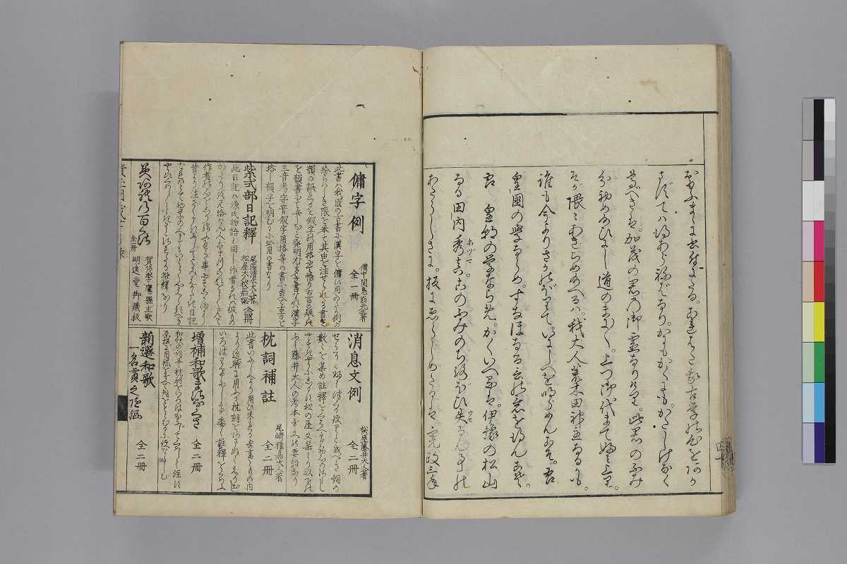 - 序題:「槻の落葉續日夲後紀歌考」序:「寛政の三とせといふ年のむ月信濃/の國人永井幸直」本文末:「天明八年八月十一日考終/宇治五十槻荒木田神主久老」跋:「板にゑらしめたるは。寛政三年」奥附:「發行/書肆/江戸日本橋南壹丁目須原屋茂兵衞/同淺草茅町二丁目同伊八/同日本橋通二丁目山城屋佐兵衞/同芝神明前岡田屋嘉七/同中橋廣小路町西宮彌兵衞/同下谷池端仲町岡村庄助/同本銀町三丁目永樂屋丈助/同十軒店英屋大助/京都三條通御幸町角吉野屋仁兵衞/尾州名古屋本町通永樂屋東四郎/同同所菱屋藤兵衞/大阪心齋橋通北久太良町河内屋喜兵衞」印記:「新居庫」