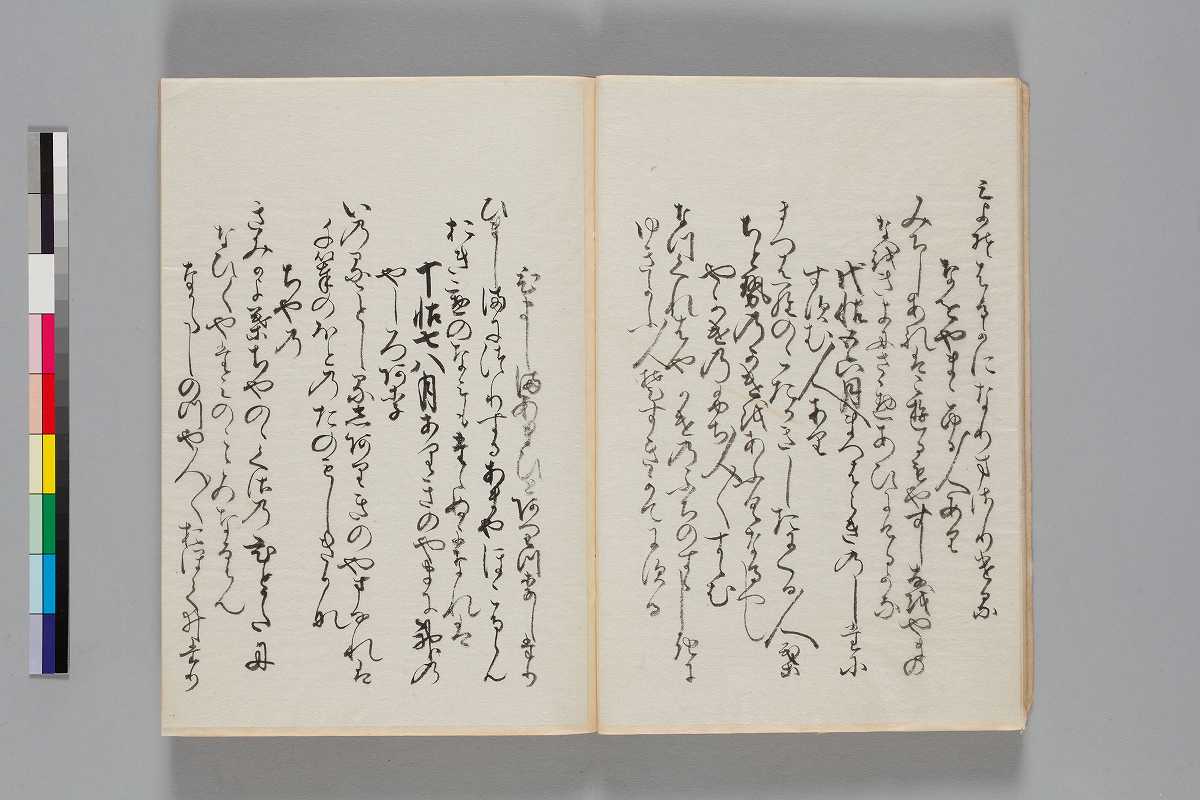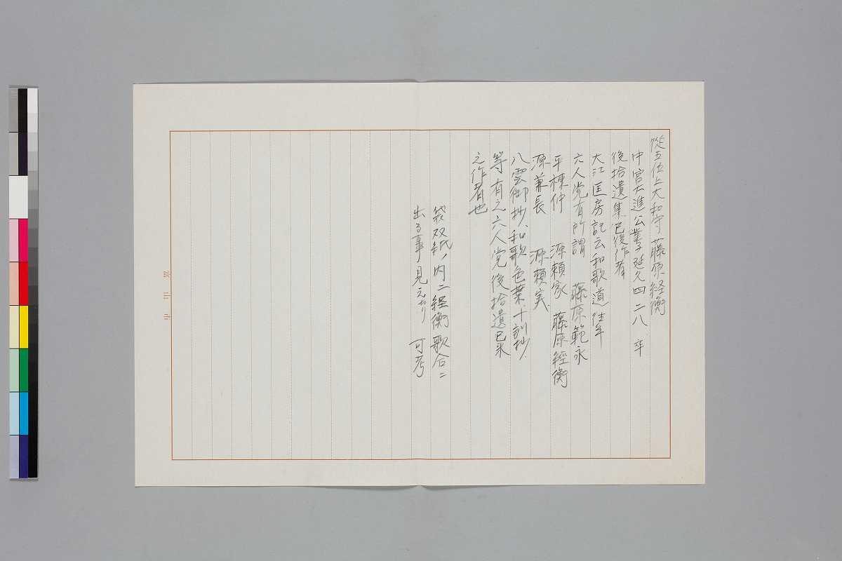 - 奥書:「明治四十二年九月廿八日南都東大寺所蔵本を以て/写し了りぬ文字の誤脱少からすみなそのまゝに/なしおきぬ興福寺畔客窓の下に/しるす/書中紙片一葉あり次に之を写す〔以上青鉛筆書き〕」最終丁オ:「従五位上大和守藤原經衡/中宮大進公業子延久四ニハ卒/後拾遺集已後作者/大江匡房記云和歌道徃年/六人黨有所謂藤原範永/平棟仲源頼家藤原經衡/源兼長源頼實/八雲御抄和歌色葉十訓抄/等有之六人黨後拾遺已来/之作者也/袋双紙ノ内ニ經衡歌合ニ/出る事見えタリ可考」